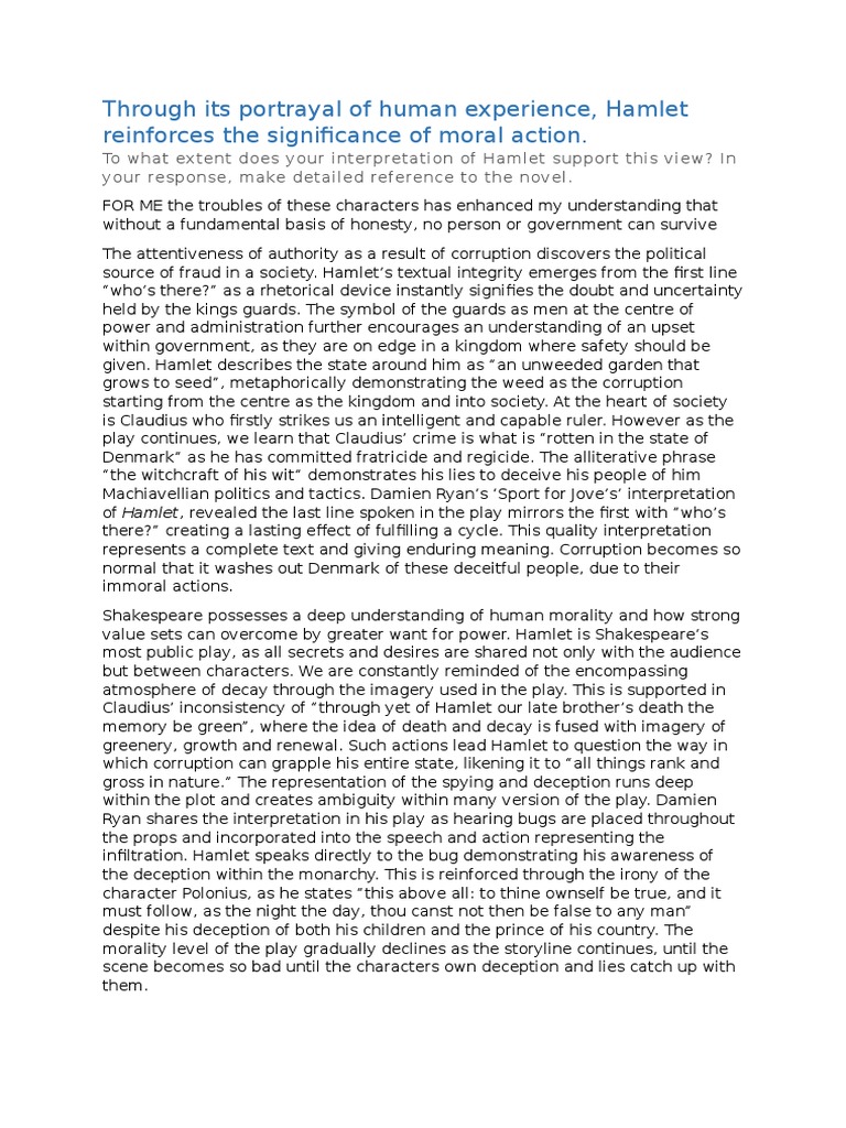 However, when approaching Hamlet, it is best to remember that numbers and statistics From missed opportunities to sporadic bursts of movement and progression, Hamlet initially struggles with his stagnancy in change and his reluctance to challenge Insanity is defined as doing something over and over again and expecting a different outcome, essay hamlet. However, although he says and does things that are out of the ordinary, he is not doing the same Hamlet Essay Death and Destruction rain on an empire as chaos runs through the streets like a plagued rat. People scramble as the very thing they trusted collapsed. Throughout time empires have fallen and risen but what has remained constant is the growth of humanity Revenge Hamlet William Shakespeare.